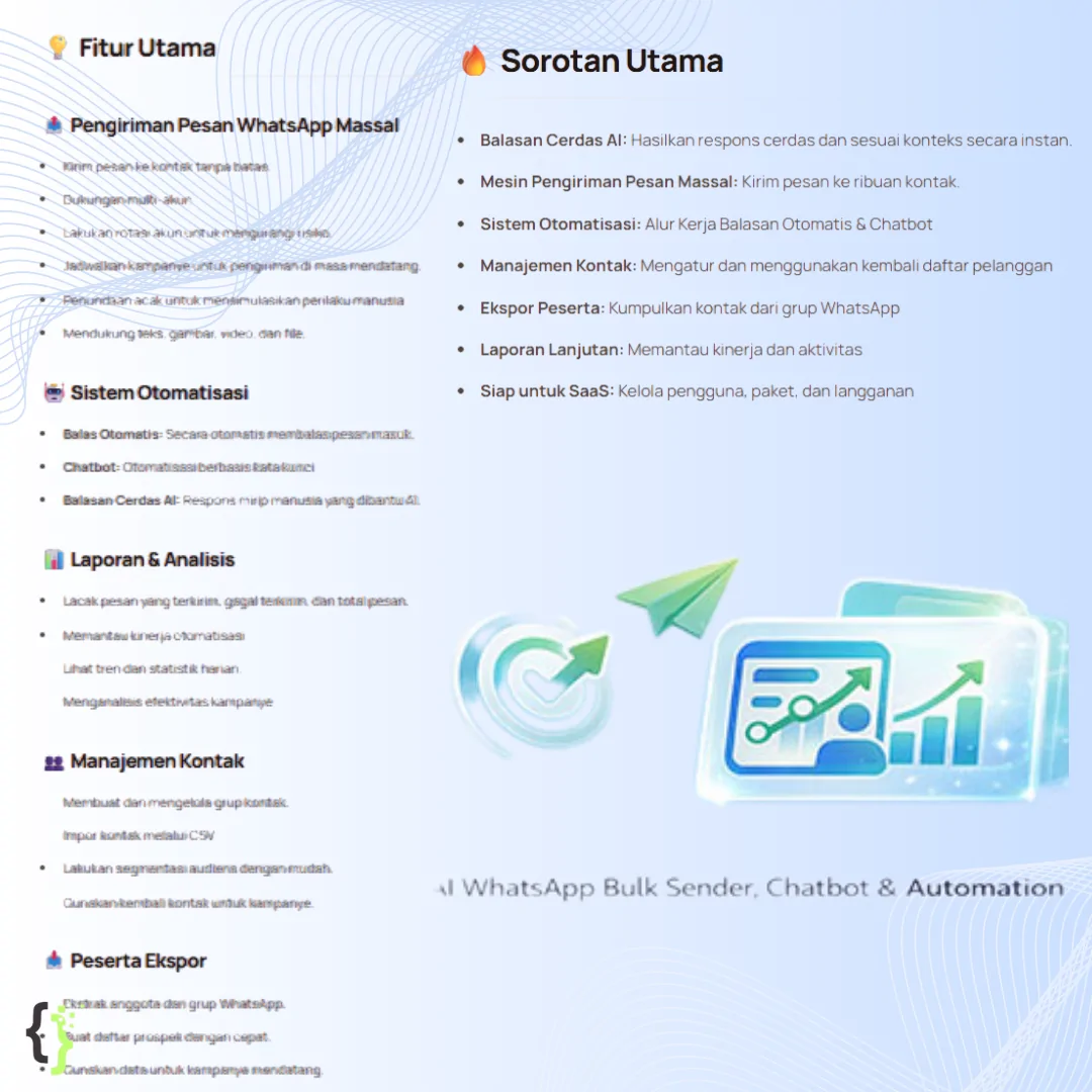 ✅ Sistem Chatbot & Alur Kerja: Bangun chatbot interaktif berbasis kata kunci untuk layanan pelanggan 24/7. ✅ Ekspor Peserta Grup: Ambil data anggota grup WhatsApp dengan sekali klik untuk database prospek.